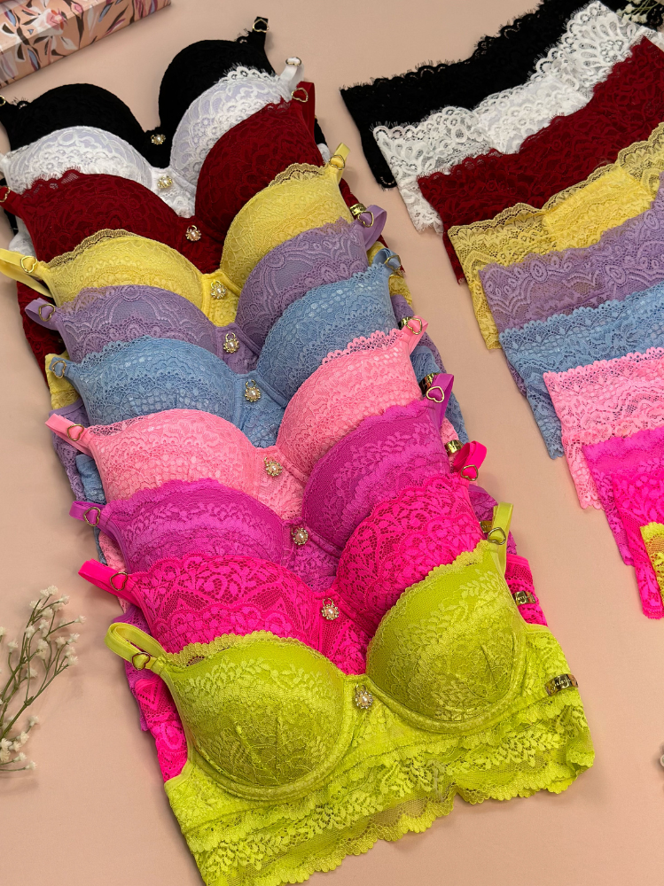 O sutiã é confeccionado em microfibra rendada, possui um pingente frontal que é um charme!